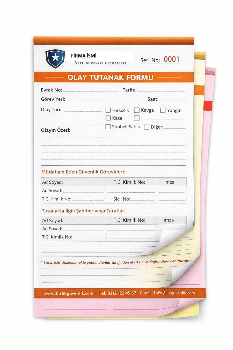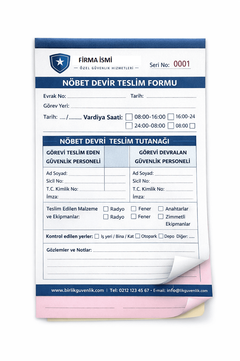 Güvenlik Şirketlerine Özel Matbu Formlar.Biz, sahadaki operasyonlarınızı kolaylaştıran tüm matbu evraklarınızı özenle üretiyoruz. Nöbet çizelgelerinden olay tutanaklarına, ziyaretçi kayıt defterlerinden teslim-tesellüm formlarına kadar ihtiyacınız olan her ürünü firmanıza özel tasarlıyor ve basıyoruz. Siz güvenliği sağlarken, biz de arka plandaki tüm basılı süreci sorunsuz şekilde yönetiyoruz.